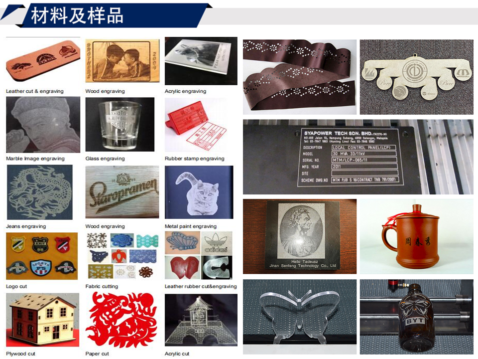 工藝品,家具,玻璃制品,木制品,聚氯乙烯,燈飾,廣告,裝飾,造紙,馬克板,郵票及印章,腈綸,竹制品,手帶及鞋子,衣服和服裝,面料等。通過對激光參數(shù)的調(diào)整,機(jī)器可以進(jìn)行多樣的雕刻和切割。這個機(jī)器具有很多優(yōu)點(diǎn):切口光滑,無接觸切割,高速雕刻,雕刻準(zhǔn)確、效果好。