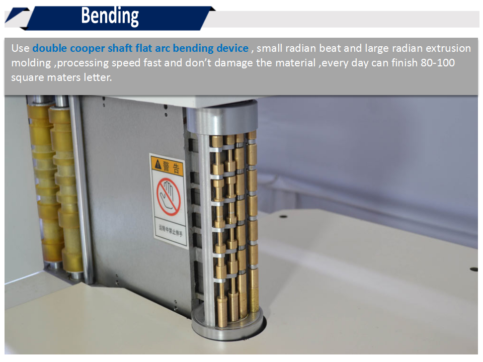 6.采用雙排銅軸設計,純平式彎弧器,小弧度拍、大弧度擠壓成型,做字速度快,而且不傷料,每天可做80-100平方字。