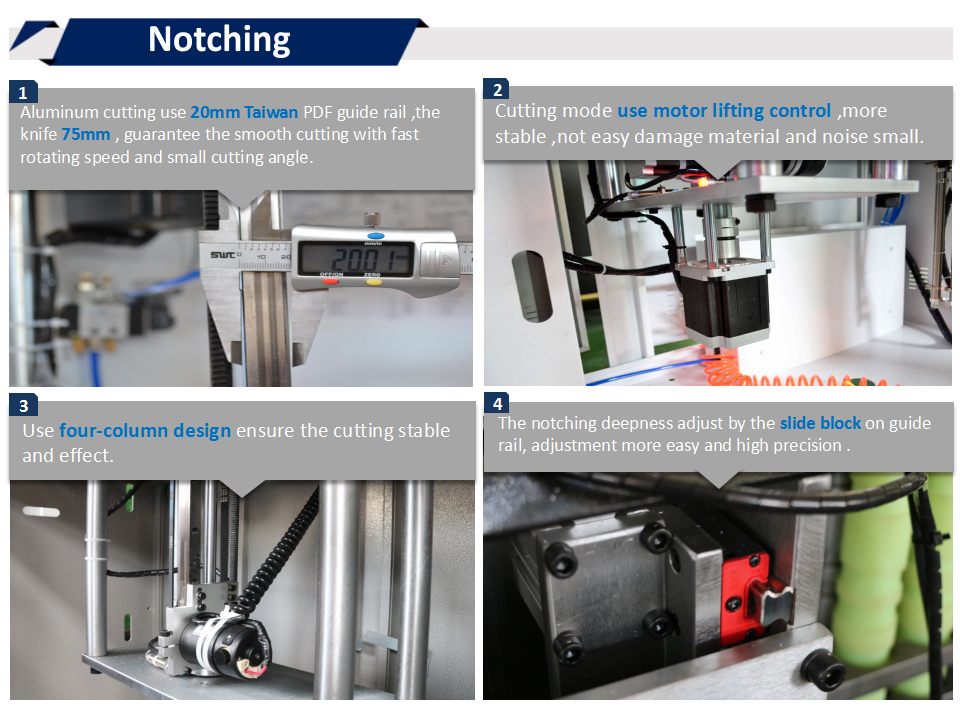 2. 鋁材切割部分使用的20mm臺灣PDF導軌,直徑75mm切割刀頭,既保證了轉速快切割更平穩(wěn),又保證能切割出小角度。